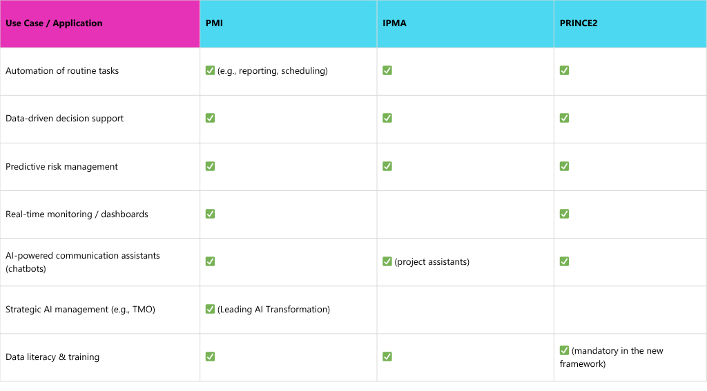 The organisations examined set their own priorities: PMI provides strategic guidelines and recommendations on how to scale AI company-wide and make it part of the PM methodology. IPMA sheds light on the attitude and maturity of the project management community and recommends investing in people and cultural change so that AI is truly accepted. PRINCE2, on the other hand, seamlessly integrates AI into its processes and demonstrates in a very practical way how project managers can utilise AI tools within existing structures – without abandoning proven principles. The following overview summarises key use cases of the three organisations in tabular form: